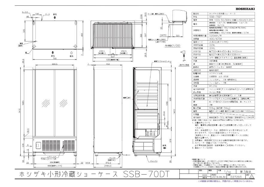 【ホシザキ】小型ショーケース SSB-70DT 幅700×奥行450×高さ1410 単相100V