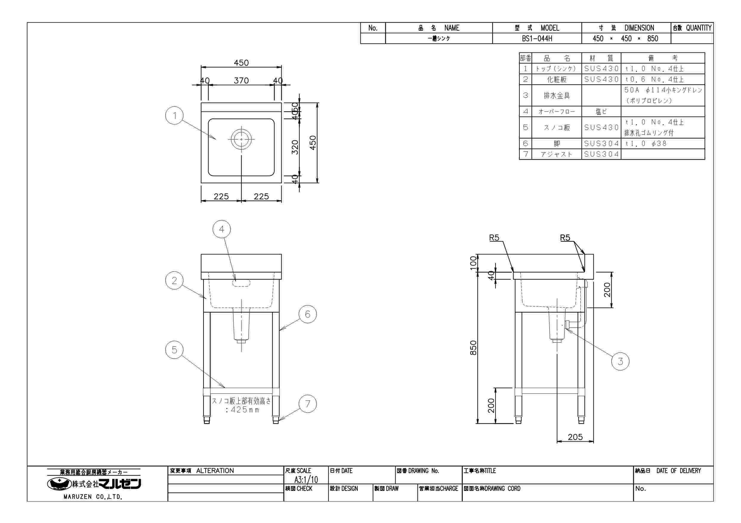 商品名:一槽シンク W450×D450×H850