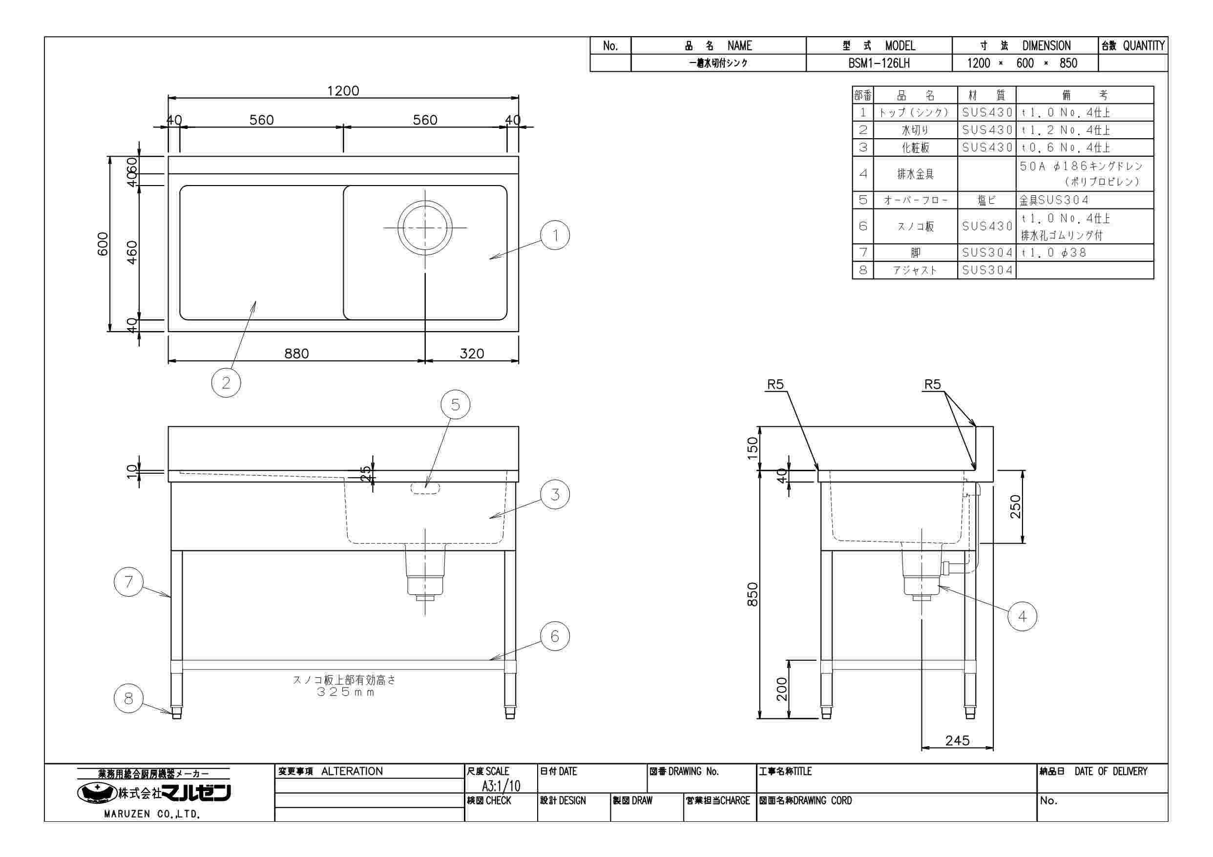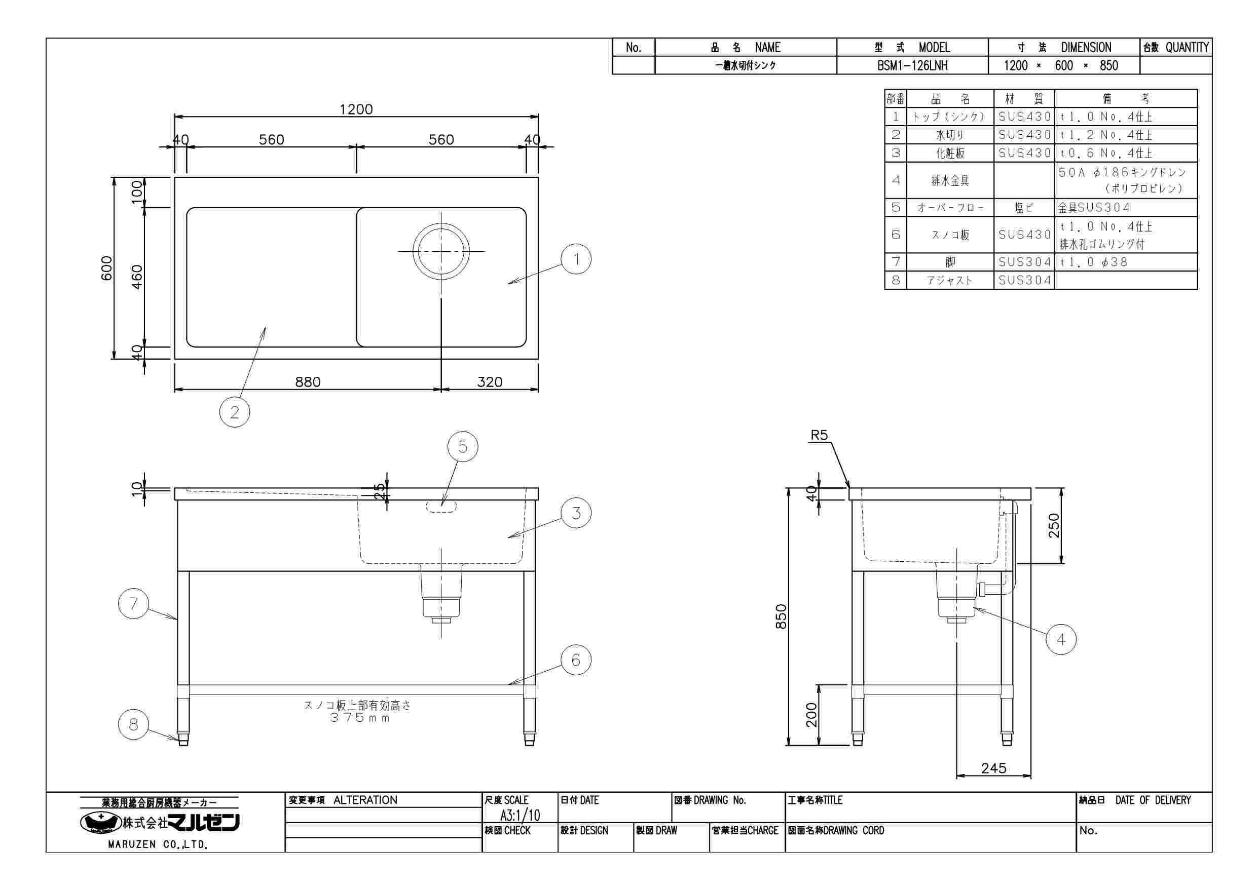 商品名:一槽水切シンク W1200×D600×H850
