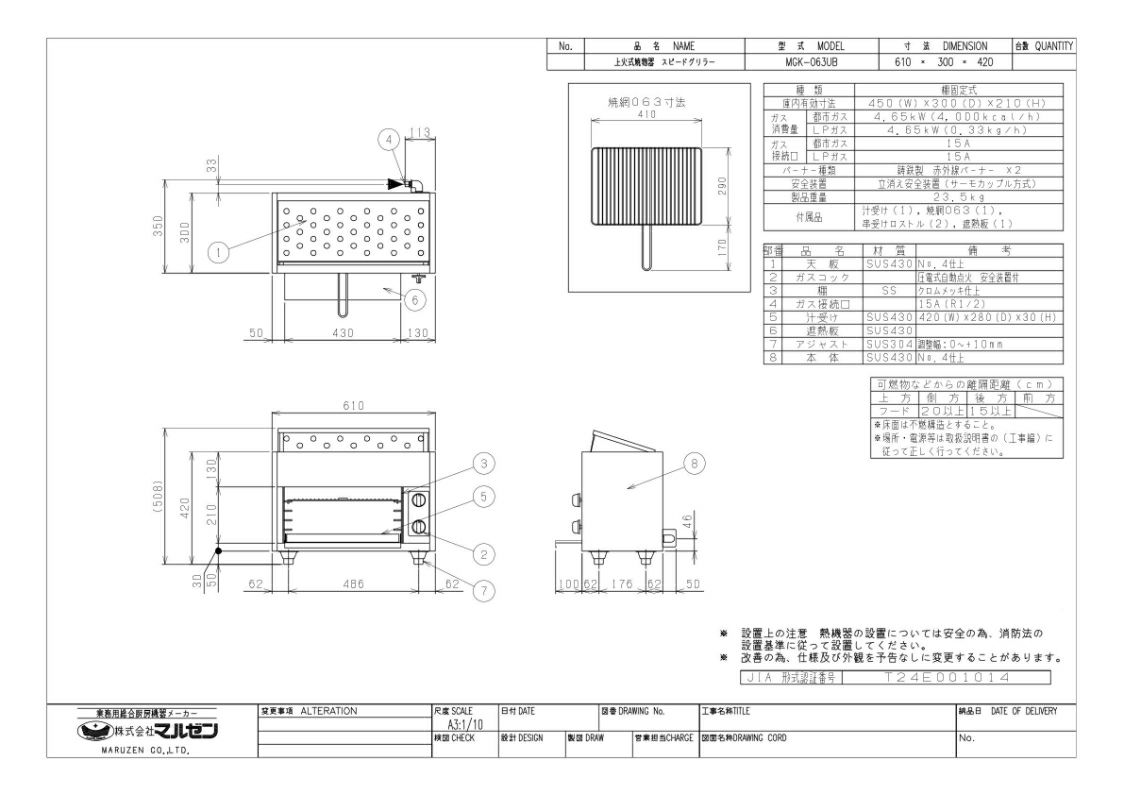 【マルゼン】ガス上火式焼物器 スピードグリラー 赤外線バーナー MGK-063UB 幅610×奥行300×高さ420mm