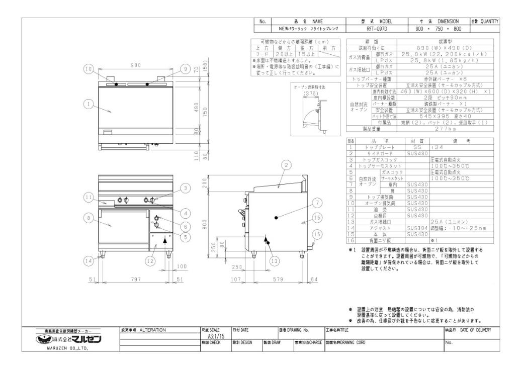 【マルゼン】フライトップレンジ RFT-097D 幅900×奥行750×高さ800