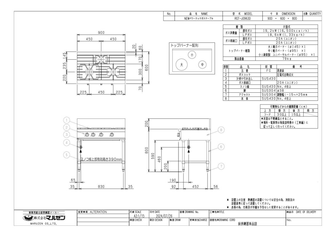 【マルゼン】ガステーブル 3口 NEWパワークック RGT-J0963D (旧型式RGT-J0963C) 幅900×奥行600×高さ800
