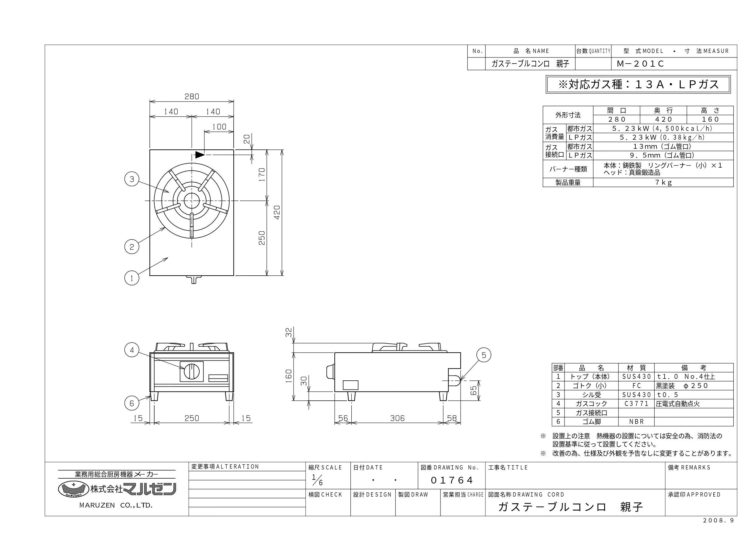 M-201C 【マルゼン】ガステーブルコンロ<親子>幅280×奥行420×高さ160