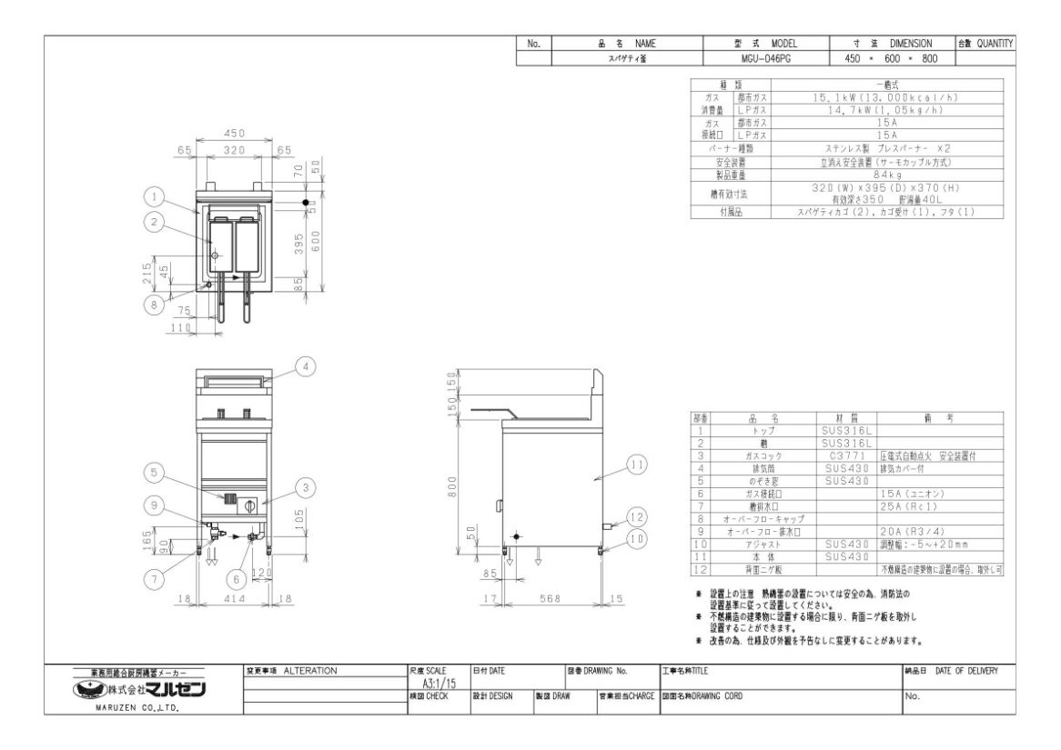 | ■ 商品概要 ■ | | 商品名 | スパゲティ釜 (ゆで麺器、ゆで麺機) | | 外形寸法 | 幅450×奥行600×高さ800(バック高さ150 )(mm) | | メーカー | マルゼン | | 型式 | MGU-046PG | | 電源 | - | | 消費電力 | - | | コンセントプラグ | - | | 内寸法/内容積 | - | | ガス消費量 | 都市ガス:15.1kW(13,000kcal/h)、LPガス:14.7kW(1.05kg/h) | | ガス接続口 | 都市ガス:15A、LPガス:15A | | 重量 | 84kg | | 付属品 | スパゲティカゴ、カゴ受け | | 特記事項 | ●調理能力:1回8食、40食/h ※能力の計算方法は乾麺1食100g、1回ゆで時間12分とした場合 ●槽の数:1 ●カゴの数:2 ●槽の水量:40L ●カゴに入る量:400g(4食分) ●排水口:25A・20A | ※ご注文の際にガス種をお選びください。 ※ガス機器の接続は、最寄のガス専門業者へご依頼ください。 |