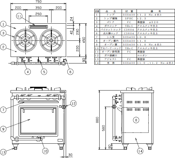 ●外形寸法:幅750×奥行450×高さ800(mm) ●使用面:片面式 ●トップバーナー数:直径175×2 ●オーブンバーナー数:下火1 ●オーブン数:1 ●オーブン庫内有効寸法:幅420×奥行320×高さ320(mm) ●ガス消費量:都市ガス 28.6kW(24,600kcal/h)、LPガス 28.6kW(2.05kg/h) ●ガス接続口(ユニオン):20A ●重量:74kg |