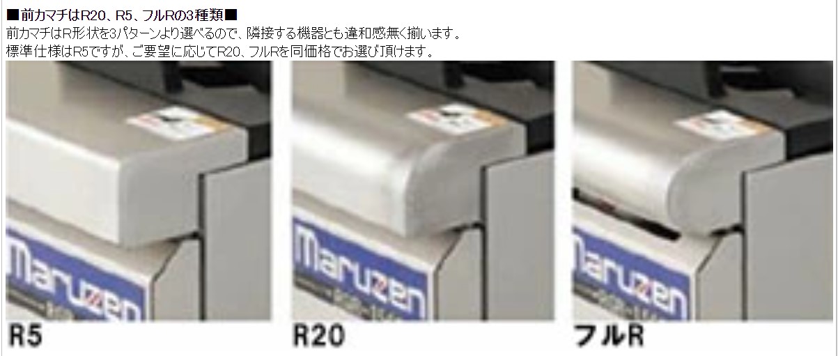 ■前カマチはR20、R5、フルRの3種類■ 前カマチはR形状を3パターンより選べるので、隣接する機器とも違和感無く揃います。 標準仕様はR5ですが、ご要望に応じてR20、フルRを同価格でお選び頂けます。