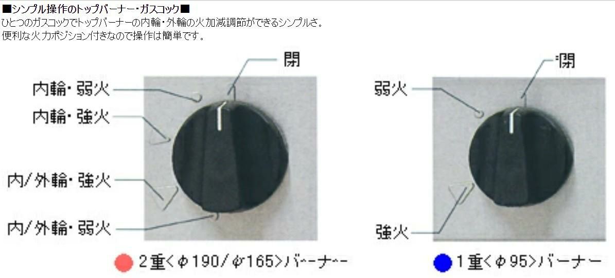 ■シンプル操作のトップバーナー・ガスコック■ ひとつのガスコックでトップバーナーの内輪・外輪の火加減調節ができるシンプルさ。 便利な火力ポジション付きなので操作は簡単です。