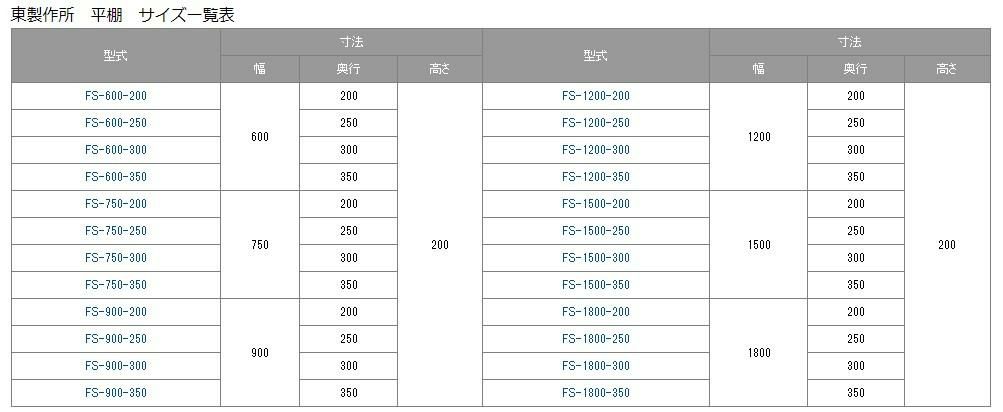 東製作所 平棚 サイズ一覧表