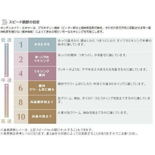 ![]() ![]() ![]() 用途にあわせて低速から高速回転まで10段階のスピード調節が可能です。3種類の撹拌ヘッド(標準装備)とスピード調節レバーの組み合わせによって生地づくりや生クリームのホイップに最適な撹拌力が得られます。必ず用途にあったヘッドをお使いください。誤った使用をされますと故障の原因にある場合があります。 ![]() ![]() キッチンエイド・ミキサーは、プラネタリー撹拌(ビーター部分と撹拌部品取付軸を、それぞれ反対方向に回転させる同一撹拌軌跡を描かない撹拌機能)によってきめの細かい均一なミキシングを可能にします。 ![]() ![]() |