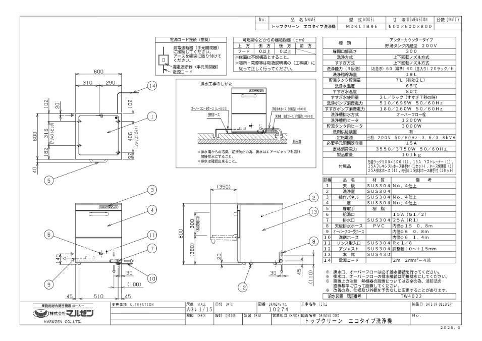MDKLTB9E【マルゼン】エコタイプ食器洗浄機 アンダーカウンター 幅600×奥行600×高さ800mm