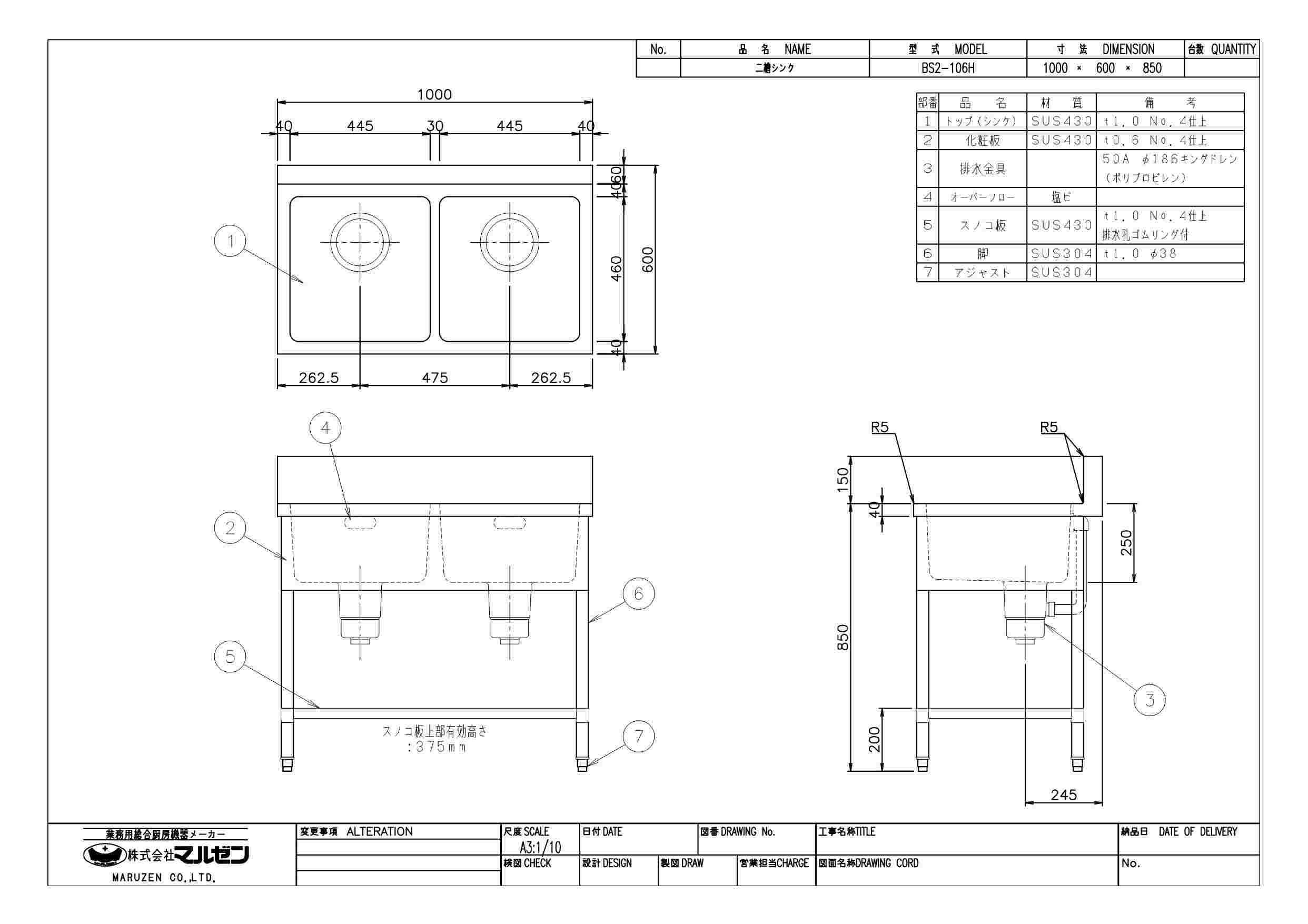マルゼン 二槽シンク サイズ一覧表