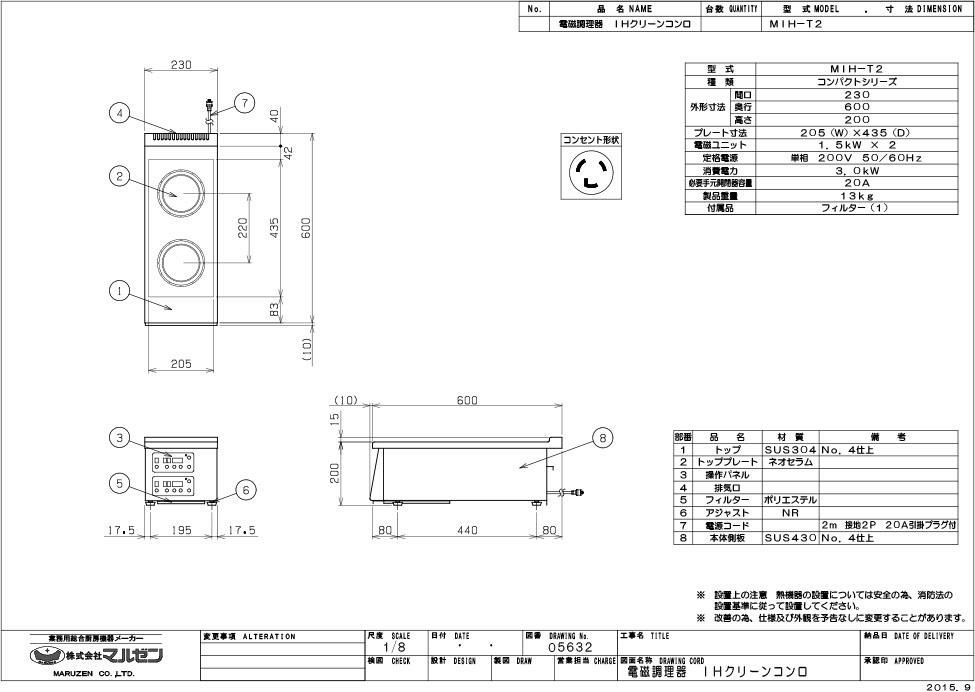 MIH-T2 【マルゼン】IHクリーンコンロ コンパクトタイプ 幅230×奥行600×高さ200 単相200V