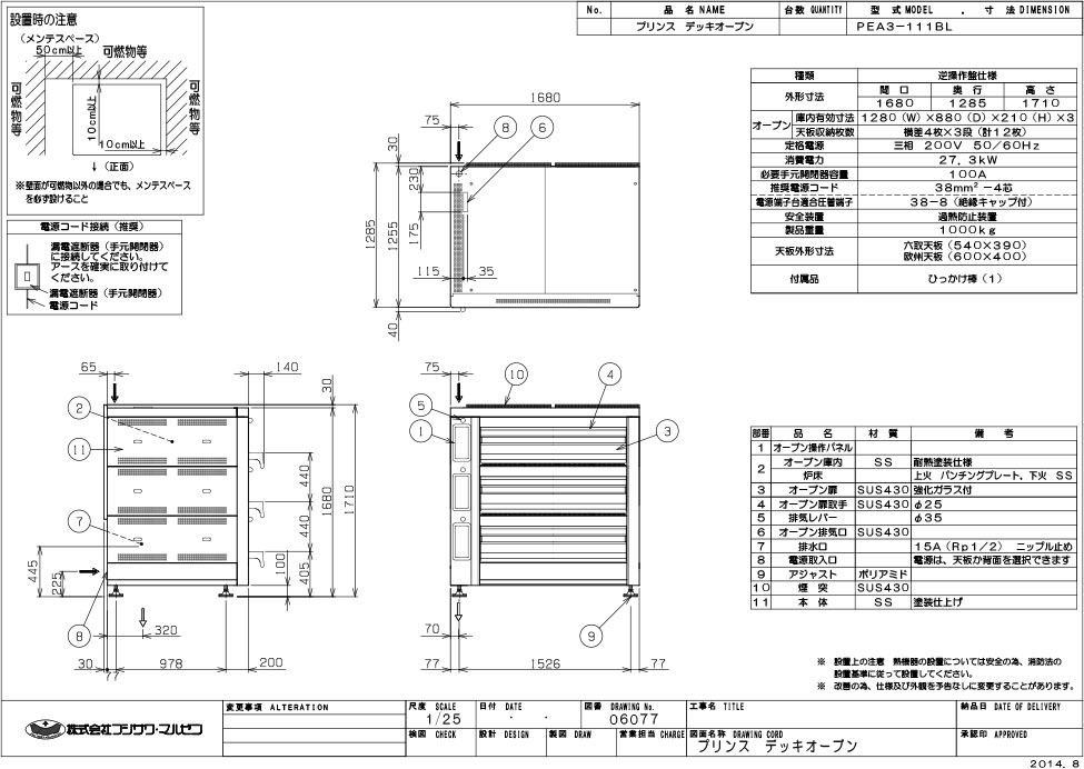【マルゼン】デッキオーブン プリンス PEA3-111BL 幅1680×奥行1285×高さ1710 三相200V