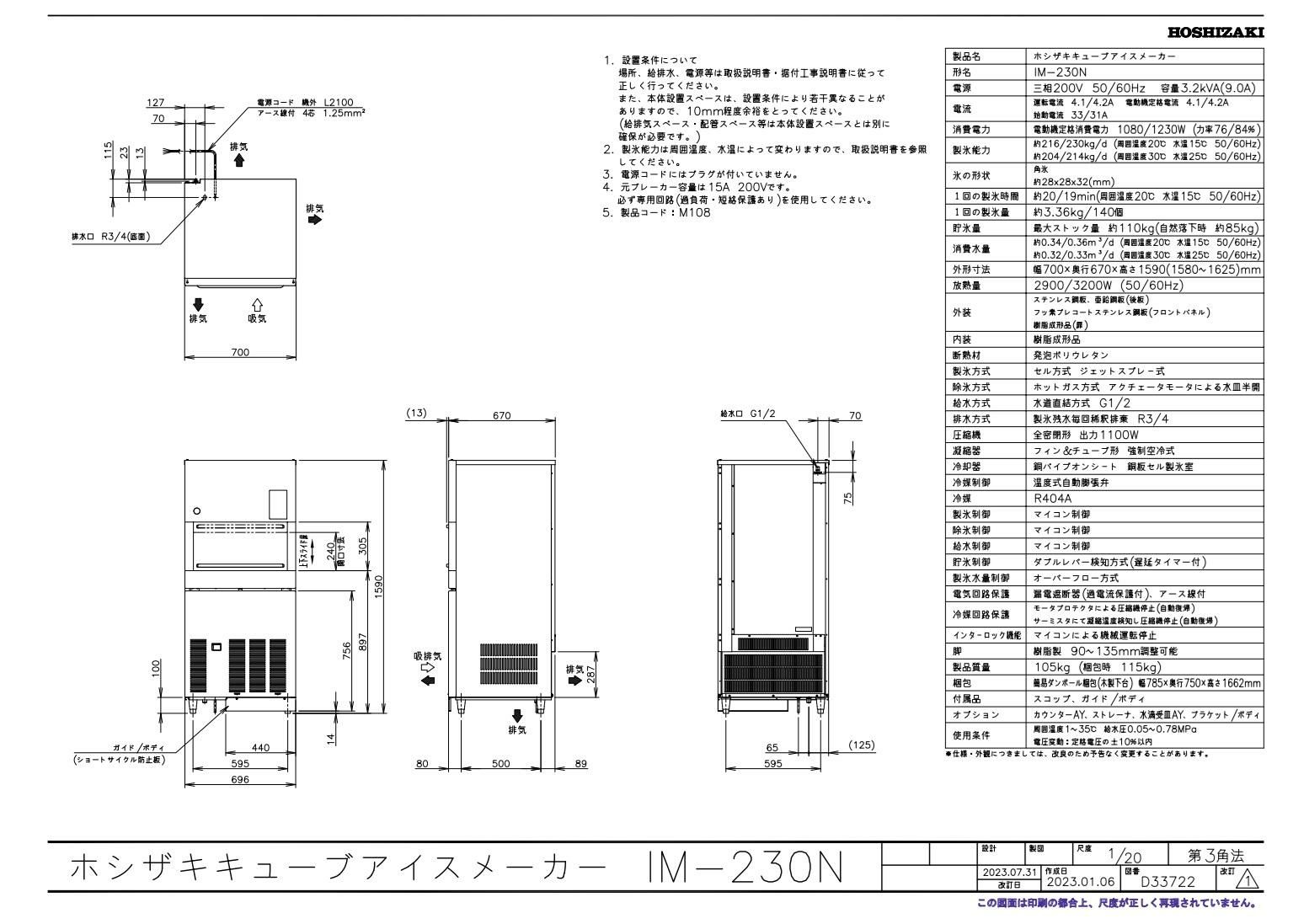 【ホシザキ】キューブアイスメーカー大形バーチカルタイプ空冷式 製氷能力:230kg IM-230N(旧型式:IM-230M-1)幅700×奥670×高1590 三相200V