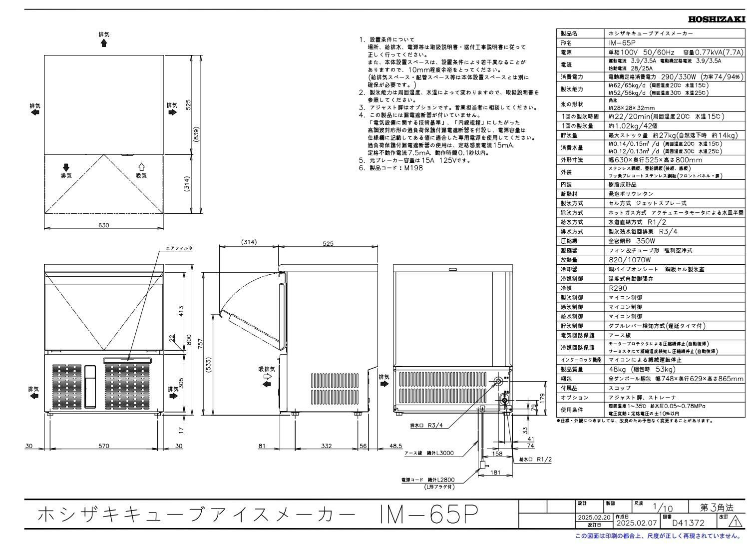 IM-65P【ホシザキ】自然冷媒製氷機キューブアイスメーカー空冷式 アンダーカウンタータイプ 製氷能力65kg幅630×奥行525×高さ800mm単相100V