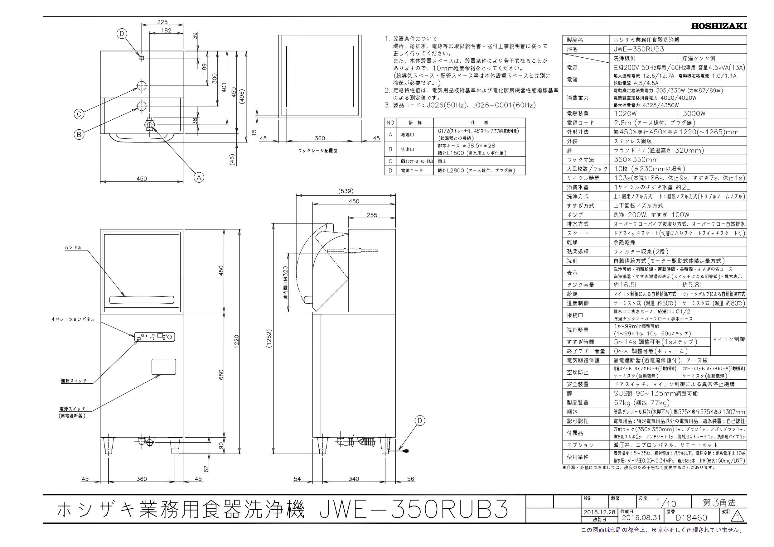 JWE-350RUB3 【ホシザキ】食器洗浄機(小形ドアタイプ) 450×450×1220 三相200V
