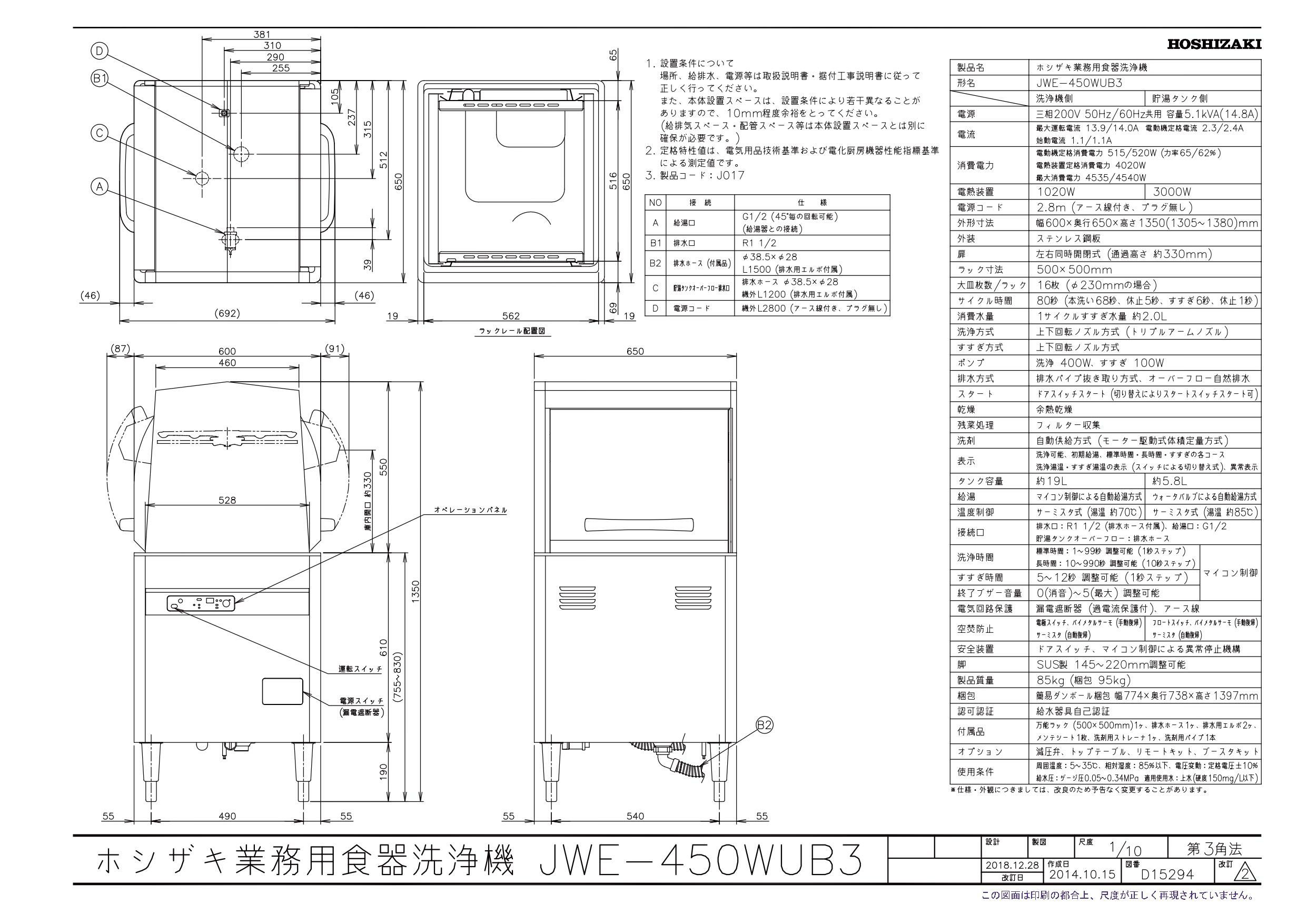 商品名:食器洗浄機(小形ドアタイプ) JWE-450WUB3 600×650×1350(mm) 三相200V