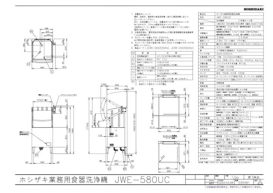 商品名:食器洗浄機(ドアタイプ) JWE-580UC 640×655×1432(mm) 三相200V