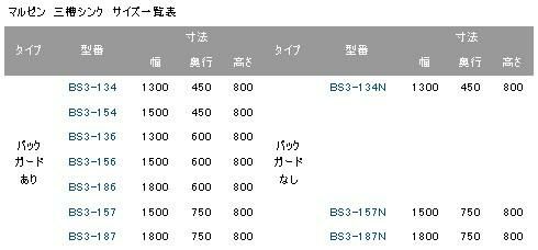 | バック ガード あり | BS3-134 | 1300 | 450 | 800 | バック ガード なし | BS3-134N | 1300 | 450 | 800 |