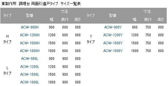 【東製作所】調理台 両面引違戸 ACW-1500H 幅1500×奥行600×高さ800mm